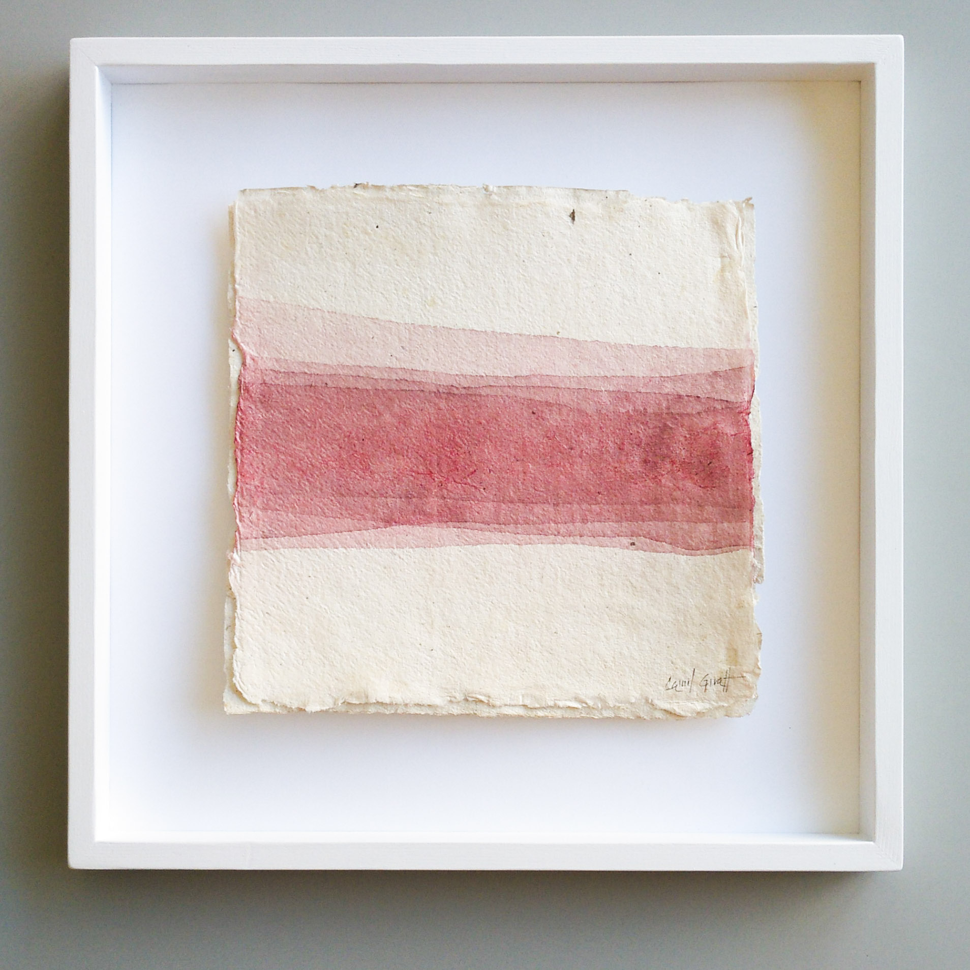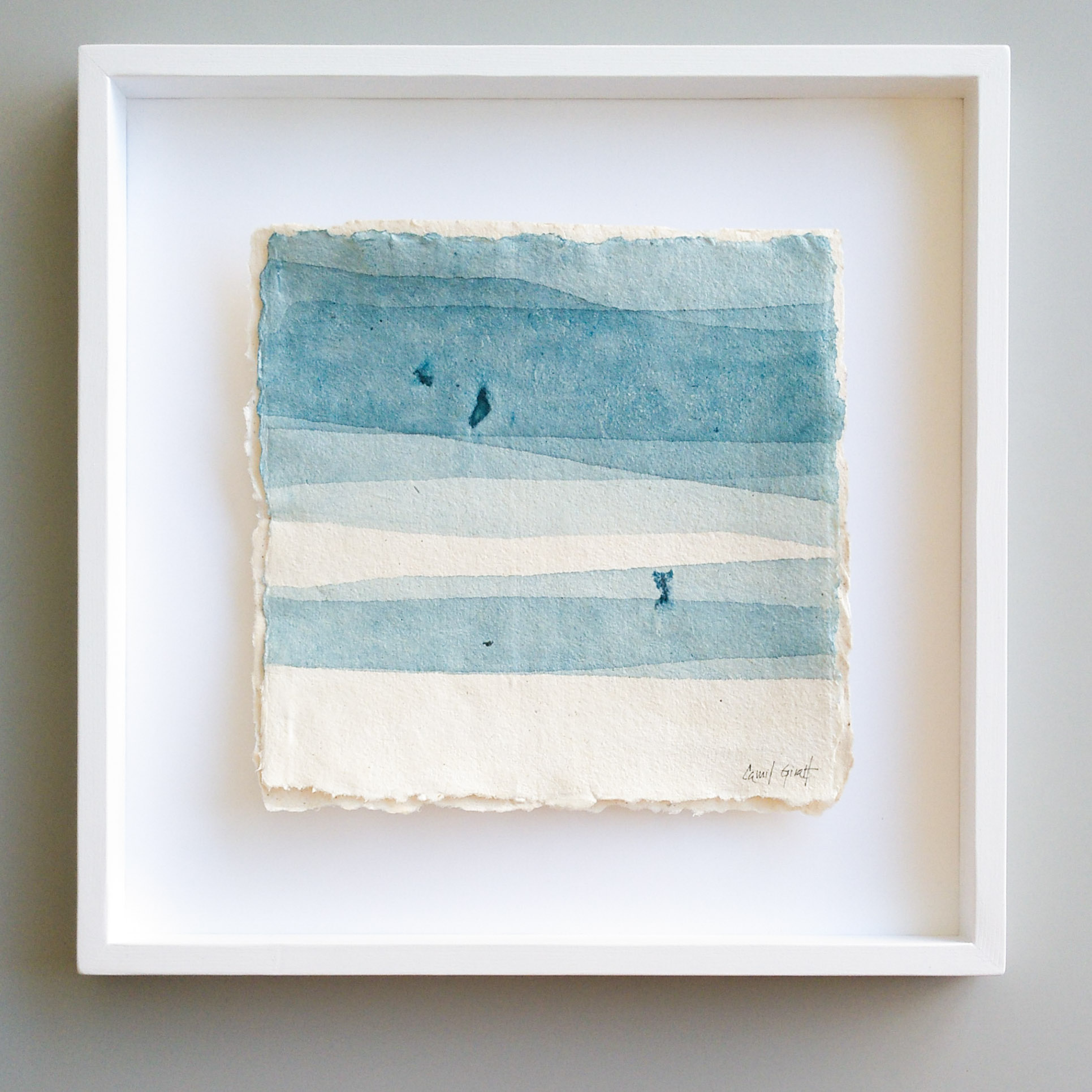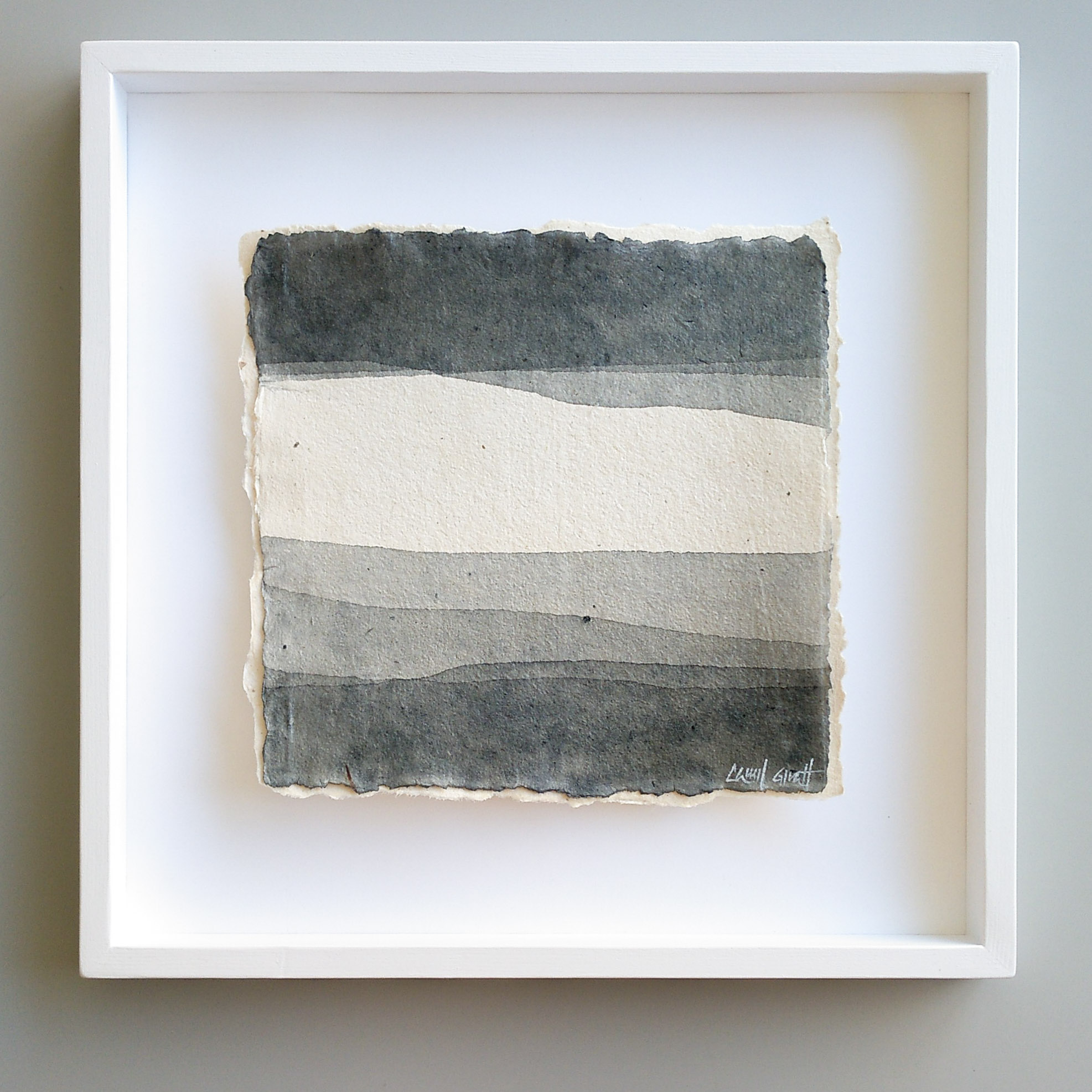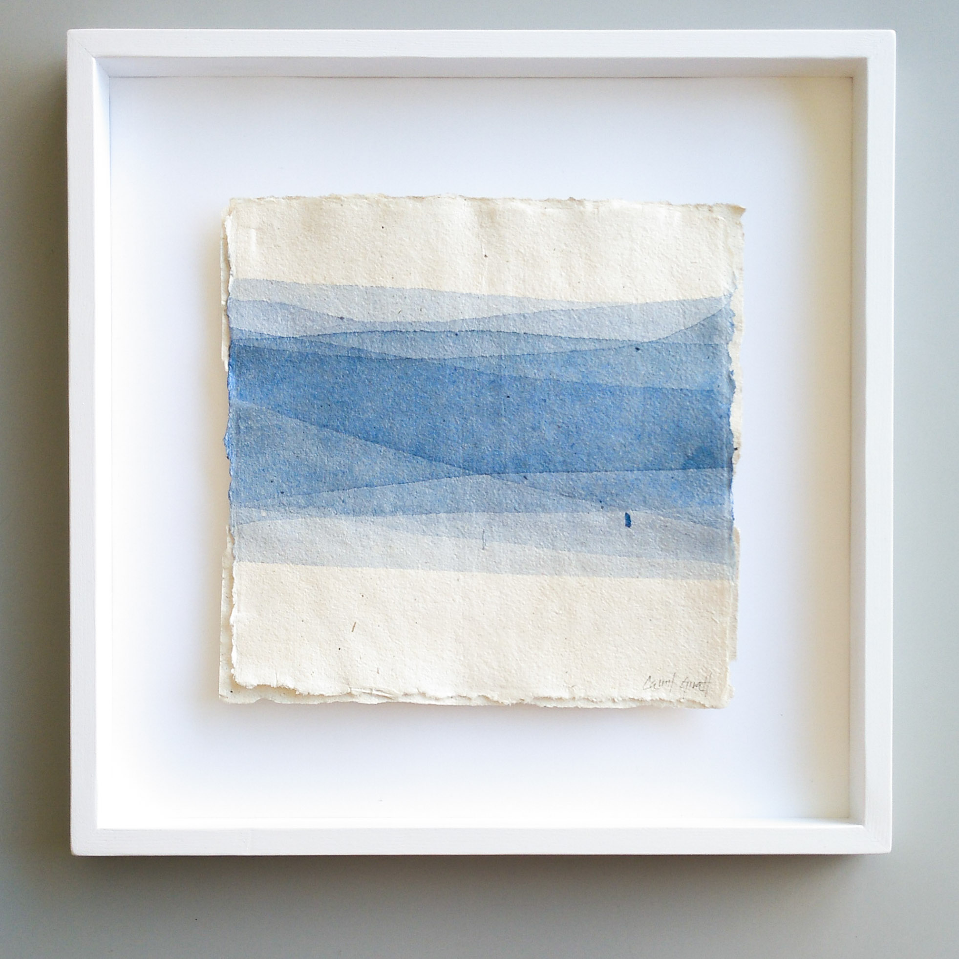Majority of my series of works takes the seascape as a reference. Open, distant, calm spaces, in which the horizon is the essential element. A horizon that is the centre of attention, and that symbolizes the stillness. I usually work with acrylic on linen fabric, but I’m currently working on other techniques and looking for new textures, which has led me to develop the lasts series on handmade paper. In these last paintings the concept has evolved, and I develop the idea of the path that leads to the inner balance. These works should be read from left to right. Its structures, sloping lines and broken horizons are a descent and advance towards the calm that can be seen beyond.